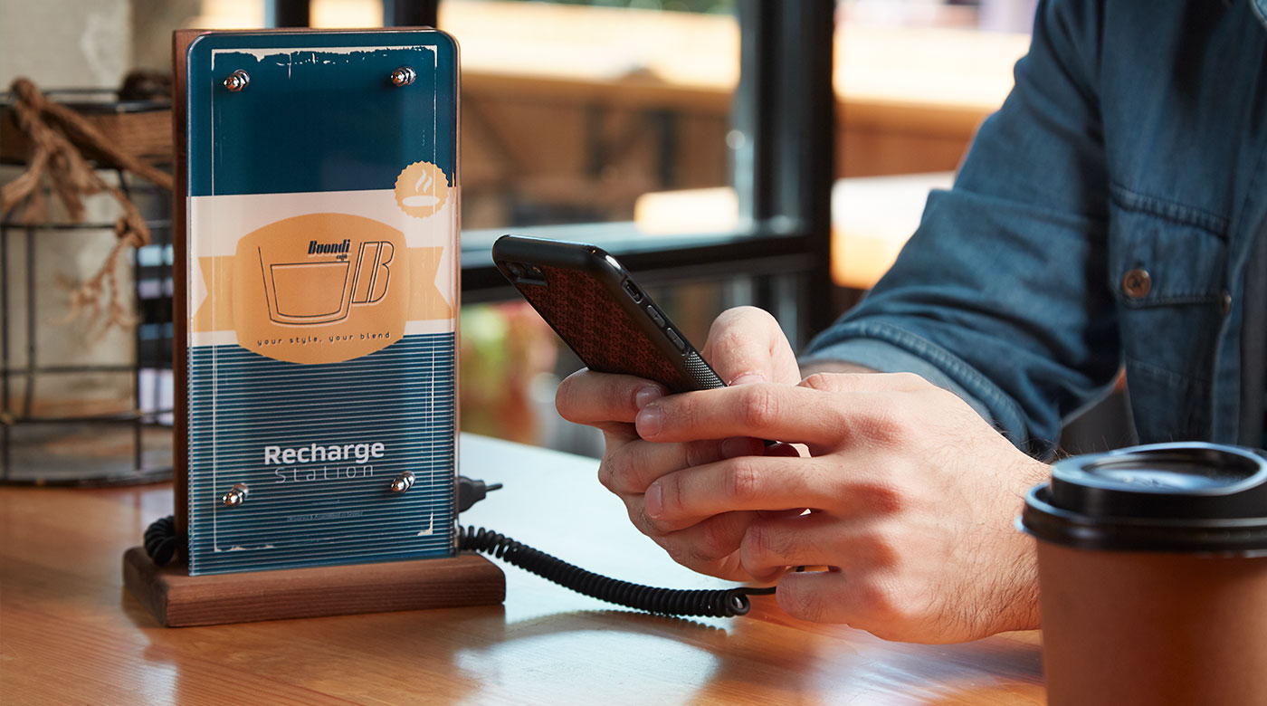 Cafe/Resto Powerbank, the 1st autonomous and 100% customizable charging solution, was designed to serve three audiences with one single product: customers, venues & brands.